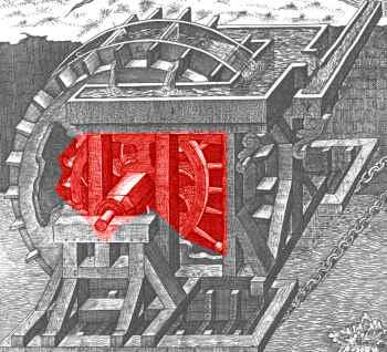 Schauen wir uns diesen Mechanismus etwas genauer an: Es handelt sich um eine Maschine mit geschlossenem Wasserkreislauf. Solche Maschinen werden auch als Rezirkulationsmühlen oder trockene Wassermühlen bezeichnet. Da das Wasser nicht von außen zugeführt wird, nannte man es aqua morta - "totes Wasser". Das herabrinnende Wasser treibt ein oberschlächtiges Wasserrad, das mittels eines Getriebes eine Getreidemühle in Bewegung hält. Um den Wasservorrat zu erneuern, wird durch eine Kurbelwelle und eine Hebelübersetzung ein Pumpwerk angetrieben, das das Wasser aus dem Sumpf des Wasserades wieder auf die Höhe der Speiserinne hebt. |