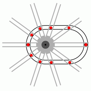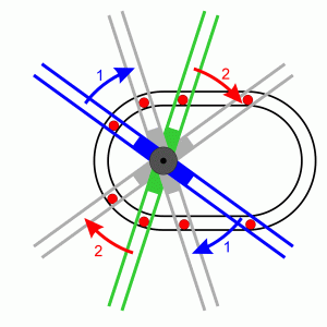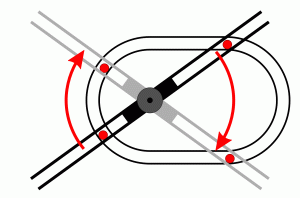 | In einem begrenzten Bereich bewegt sich die rechte Kugel durch ihr Eigengewicht von oben nach unten. Sie hebt dabei die linke Kugel um einen entsprechenden Bruchteil. Die Schwerkraft wirkt hier als Antrieb. In der Praxis ergäben sich auch hier Verluste, da die Kräfte auf die gekrümmten Schienen den gleichen Gesetzmäßigkeiten unterliegen wie die an einer schiefen Ebene | |