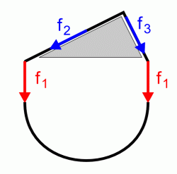 Aus der Symmetrie konnte Stevin schließen, daß rechts und links an der Kette die Kraft f1 angreift. Für die weitere Betrachtung ist deshalb der untere, bogenförmige Teil der Kette verzichtbar. Die beiden Kräfte f2 und f3 müssen für sich allein das Gleichgewicht der Kette bewirken, folglich gleich sein. Damit läßt sich ermitteln, wie die Neigung der Ebene die an einer Masse angreifende Kraft beeinflußt.