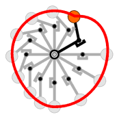 Stellen wir uns vor, dieses Rad wird mit mäßiger Geschwindigkeit angeworfen. Lassen wir Lagerreibung und Luftwiderstand außer Acht, dann wird der Apparat dennoch nicht ewig laufen, sondern schnell zum Stillstand kommen. Der Erfinder hat übersehen, daß die knickenden Hebel gegen die Widerlager prallen. Egal ob dieser Aufprall elastisch oder unelastisch erfolgt, er trägt zur Verlangsamung des Laufes bei, da durch innere Reibung im Material ein Teil der Bewegungsenergie in Wärme umgesetzt wird.