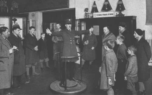 In vielen naturwissenschaftlich-technischen Museen wird dieser Versuch mit einer Drehscheibe vorgeführt. Die Wirkung des Drehimpuls-Erhaltungssatzes läßt sich unmittelbar beobachten. Hier ein altes Bild von der Rückseite einer Publikation des Deutschen Museums in München: