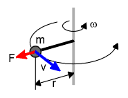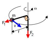 Der Stab, der m mit der Welle verbindet, wird normalerweise als masselos und starr angenommen. Tatsächlich ist es für den Drehimpuls der Masse m irrelevant, ob der Stab starr ist; es könnte genausogut eine gespannte Feder sein, eine gespannte, weiche Schnur o.ä. Wichtig ist nur, daß die innere Spannung des Verbindungsgliedes bei Radius r exakt der Fliehkraft F entspricht, allerdings in umgekehrter Richtung. Womit wir bein nächsten Thema sind: der Fliehkraft.
