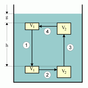 Die Masse des Auftriebskörpers und die Volumina V1 and V2 werden geeignet gewählt. Wir erwarten eine Art Kreisprozeß: