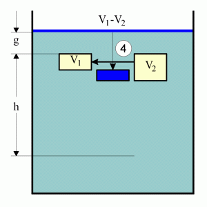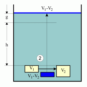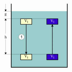 | Schritt 1: Das Objekt sinkt. Damit bewegt sich dasselbe Volumen Flüssigkeit V1 nach oben. | Schritt 3: Das Objekt steigt auf. Das äquivalente Flüssigkeitsvolumen V2 bewegt sich nach unten. |