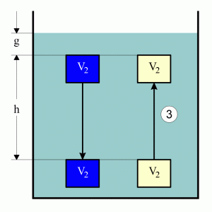 Zunächst untersuchen wir die beiden senkrechten Bewegungen 1 und 3. Wir rekapitulieren, wie Auftrieb zustande kommt: die Kraft, die auf das eingetauchte Objekt wirkt, entsteht durch den Unterschied der Druckkräfte auf Ober- und Unterseite des Objektes. Wenn ein Objekt absinkt oder aufsteigt, wird das entsprechende Flüssigkeitsvolumen an den Ausgangsort des Körpers transportiert.