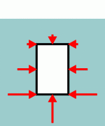 | Die Pfeile illustrieren die wirkenden Kräfte. Der Auftrieb errechnet sich aus der Höhendifferenz a und der Fläche, die auf einer Breite von 2a dem Druck ausgesetzt ist. Die wirksame Auftribskraft ist folglich 2a2 mal eine von der Dicke b des Objektes abhängige Konstante. | Die Dicke des Objektes hat sich nicht geändert. Die wirksame Auftriebskraft berechnet sich aus der doppelten Höhe des Objektes und der einfachen Breite, sodaß wieder eine Kraft wirkt, die von 2a2b bestimmt wird. Es bleibt folglich alles beim alten. |