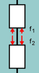 Ein näherer Blick zeigt, daß die Kraft f1, die am Boden des oberen Schwimmers angreift, geringer sein muß als f2, die auf den unteren Schwimmer wirkt. Die resultierende Kraft zeigt folglich nach unten, was eher nicht im Sinne des Erfinders ist. Man kann diese Betrachtung für alle benachbarten Schwimmer wiederholen, mit dem Ergebnis, daß wir eine abwärts gerichtete Kraft beobachten. Mit einer Ausnahme... |