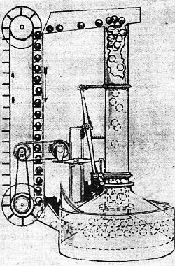 Eine Kette wird durch die Gewichtskraft der schwimmfähigen Kugeln angetrieben. Die Kugeln steigen in einem wassergefüllten Schacht auf. Mittels zweier Schieber, die verlustfrei arbeiten sollen, wird der Weg für die Kugeln freigegeben und gleichzeitig das Ausrinnen des Wassers verhindert. |