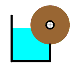 Noch einfacher ist der nächste Entwurf, der aus einem Holzrad besteht, das einseitig in einen Flüssigkeitstank getaucht wird. Der einseitige Auftrieb soll eine rechtsläufige Drehung des Rades bewirken. Der Erfinder war sich nicht bewußt, daß der Flüssigkeitsdruck und damit auch der Auftrieb nicht senkrecht nach oben wirken, sondern von allen Seiten senkrecht auf die Oberfläche des eingetauchten Objektes. Das Holzrad erwies sich als Perpetuum Stabile, was kaum überrascht: