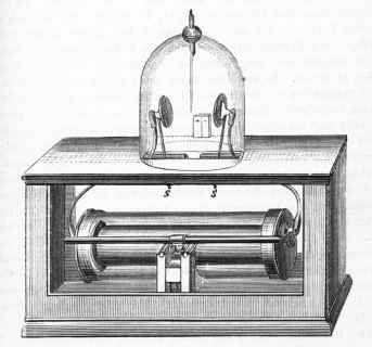 | Elektrostatisches Perpetuum Mobile Die galvanischen Elemente sind in den Säulen verborgen | Eine andere Ausführungsform mit einem Elektroskop. Diese hier wurde als nützliches und empfindliches Nachweisinstrument für Elektrizität sehr geschätzt. Es mußte lediglich dafür gesorgt werden, daß die Blättchen weit genug von den seitlichen Elektroden entfernt waren, um nicht selbsttätig zu oszillieren. Durch die Vorspannung genügten dann bereits kleine Ladungsmengen, um eine Reaktion des Elektroskopes hervorzurufen. Vgl. Recknagel, Experimentalphysik S.489. |