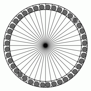 Sie stammt von Désaguliers, der sie 1720 veröffentlichte. Wer ein wenig Gefühl für Technik und Maschinen hat, sollte sich fragen: kann Somersets Rad wirklich so ausgesehen haben? Eine einfache Rechnung zeigt, daß die Anzahl der Fächer und ihre Größe mit dem Durchmesser des Rades gut harmonieren. Punktförmige Massen mögen in der Theorie nützlich sein, aber in der Praxis wenig brauchbar. Aus welchem Material sind die Gewichte? Stein ist billig oder vielleicht waren eiserne Kanonenkugeln verfügbar. Die Durchmesser der Kugeln errechnen sich dann zu: