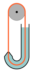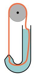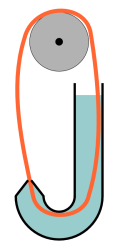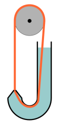Ein klassischer Vorschlag zum Bau eines Perpetuum Mobile basiert auf einem schwimmfähigen, biegsamen und gut geschmierten Seil. Das Seil soll in einem asymmetrischen U-Rohr laufen. Auf der niedrigen Seite (links) ist eine Dichtung vorgesehen, die zwar das Seil hindurchgleiten läßt, aber das Ausdringen der Flüssigkeit verhindert. Die Idee ist klar. Der einseitige Auftrieb des Seiles im längeren Teil des Rohres soll zu einer immerwährenden Bewegung führen.