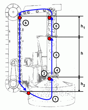 Eine Kette wird durch die Gewichtskraft der schwimmfähigen Kugeln angetrieben. Die Kugeln steigen in einem wassergefüllten Schacht auf. Mittels zweier Schieber, die verlustfrei arbeiten sollen, wird der Weg für die Kugeln freigegeben und gleichzeitig das Ausrinnen des Wassers verhindert. |